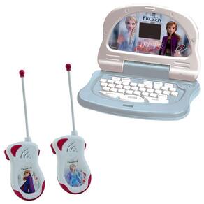 Além do laptop, o kit também inclui um Walkie-Talkie infantil da Frozen. Com ele, as crianças podem se aventurar em desafios congelantes ao lado da Anna e Elsa. O Walkie-Talkie possui um alcance de até 5 metros, permitindo que as crianças se comuniquem com seus amigos à distância.