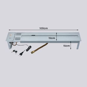 • Tamanho: 100 cm (c) x 15 cm (a) x 15 cm (l); • Queimador linear: 77 cm | 1 linha de fogo; • Área de aquecimento: 60 m² - Considerando pé direito de até 2.80m; • Consumo de gás: 480 g/h; • Peso: 12 kg; • Acabamento: cinza fosco | tinta especial para altas temperaturas; • Material: aço carbono; • Acendimento: manual com faísca elétrica (igual a um forno a gás); • Dispositivo de Segurança: Termopar – Sistema que corta o gás na ausência do fogo, semelhante a um forno a gás; • Voltagem: bivolt; • Ambiente para uso: interno - protegido do sol e intempéries; • Regulagem de chama: 5 níveis de altura; • Pedras vulcânicas inclusas para decoração; • Instalação: Uso embutido (semelhante a um cooktop); • Chaminé: Recomendado somente quando o tamanho da lareira não estiver de acordo com tamanho do ambiente. Sempre é necessário ter uma janela no mesmo ambiente para deixar um fresta aberta para renovação do ar; • Cheiro: Toda lareira a gás, a álcool ou a lenha possui chama real e por consequência um cheiro característico. A lareira a gás quando instalada corretamente, ao ser acesa irá gerar um cheiro leve que não irá incomodar; • Pressão de gás: Baixa pressão 2kg; • Tubulação de gás: Mínimo de ½” (polegada), deixar rosca macho no interior do nicho; • Tipo de gás: GN ou GLP – informar no ato da compra; Observação: O gás GLP apresenta uma chama com base azulada e pontas amareladas. Já o gás GN, isto é, o natural, apresenta uma chama completamente azul;