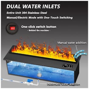 Lareira elétrica a vapor de água com efeito de chama atomizada 3D realista, produzida por sistema de nebulização ultrassônica que gera vapor iluminado por LEDs para simulação visual precisa sem emissões de fumaça ou calor. Inclui controle manual do nível de água para manutenção constante da névoa e desempenho otimizado da chama simulada, além de controle remoto para ajuste da intensidade da chama e do efeito de nebulização. Projetada para instalação embutida em ambientes internos ou comerciais, opera em voltagem 110V-120V / 60 Hz com cabo de alimentação de 1,52 metros (5 pés) e padrão de tomada americano. Estrutura em metal com acabamento em pintura eletrostática, sem necessidade de ventilação externa. Compatível com uso em salas de estar e centros de entretenimento para efeito decorativo moderno.?