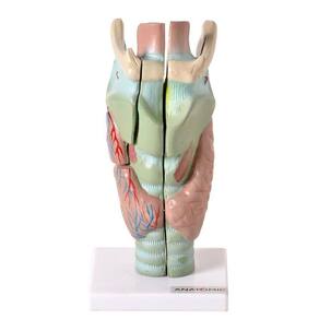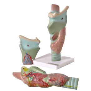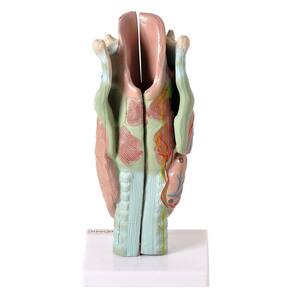 Modelo anatômico, exibe a laringe em 3 partes, ampliada uma vez o tamanho natural. Confeccionado em resina plástica semi-emborrachada, montado sobre base.