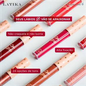 Batom líquido com acabamento matte. Latika Lip Matte possui fórmula de longa duração que confere cobertura uniforme aos lábios sem craquelar ou borrar no decorrer do dia.
