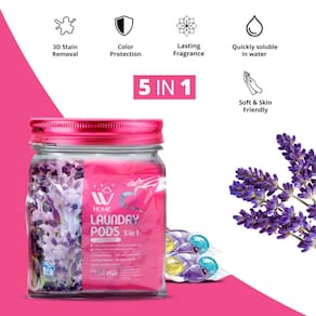 - WBM As cápsulas de roupa 5 em 1 apresentam uma fórmula ultraconcentada com extratos naturais de lavanda, garantindo que suas roupas mantenham um aroma fresco de longa duração após cada lavagem.