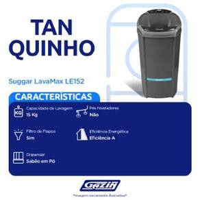 Lav 15kg suggar lavamax eco Descrição Potência: 500w Capacidade: 15 kg Dispenser para sabão: sim Níveis de água: 3 níveis Filtro cata-fiapos: sim Timer: sim Desligamento automático: sim Quantidade de molhos: 3 molhos Consumo baixo: : 0,10kwh/ciclo Inmetro: a . Dimensões do produto Altura: 96,1 cm Largura: 49,8 cm Profundidade: 54 cm Peso: 10,19 kg . Dimensões da embalagem Altura: 96,7 cm Largura: 50,4 cm Profundidade: 54,6 Peso: 11,54 kg Marca: Não Informado Ean: 7908312818296