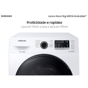 -Lava e seca suas roupas com maior eficiência, cuidando dos tecidos e economizando água e energia. -Lava, seca e esteriliza a seco - 3 em 1 Roupas sempre bem cuidadas com a lavadora que lava, seca e esteriliza a seco. Com o ciclo de lavagem a seco, você elimina odores indesejáveis e até 99,9% das bactérias e alérgenos que causam problemas respiratórios, sem usar água ou sabão. Ideal para proteger sua saúde e a da sua família. -Bolhas poderosas - Ecobubble™ A tecnologia exclusiva Ecobubble™ produz bolhas de sabão que tornam a lavagem muito mais cuidadosa e poderosa. Ela facilita em 40x a penetração do sabão no tecido e promove uma lavagem mais eficaz mesmo com água fria e com mais economia de energia. -Eficiência energética, mais silenciosa e 10 anos de garantia no motor - Digital Inverter Mais economia de energia e muito menos barulho ao lavar suas roupas, além dos 10 anos de garantia no motor com a tecnologia Digital Inverter da Samsung. -Praticidade e rapidez - Lavagem rápida em 15min e Lava e Seca em 59min A WD11A lava e centrifuga as roupas em 15min no ciclo rápido destinado a pequenas cargas, com sujeira leve. Ela ainda possui um ciclo de lavagem e secagem de 59min para garantir mais praticidade e tempo pra você. -Limpeza profunda com vapor eliminando 99,9% de bactérias - Vapor de higiene Higienize suas roupas com o poderoso ciclo de vapor que libera ar quente, removendo sujeiras profundas e 99,9% das bactérias e alérgenos inativos. -Sua máquina sempre limpa - Lavagem do Tambor Eco Mantenha sua máquina limpa de maneira ecológica. A Lavagem do Tambor Eco remove 99,9% das bactérias causadoras de odor do tambor sem usar produtos químicos e ainda ajuda na manutenção do seu produto. E você ainda recebe uma notificação de quando a sua máquina precisa ser limpa. -Delicadeza para proteger os tecidos - Diamond Drum O design do tambor da lava e seca Samsung é delicado com as suas roupas. Os pequenos relevos em formato de diamante do tambor também ajudam a proteger os tecidos, reduzindo o atrito e prevenindo que suas roupas desfiem durante a lavagem. -Lavagem intensiva para as manchas mais difíceis - Função Manchas Difíceis A função Manchas Difíceis ajuda a remover uma grande variedade das manchas mais difíceis. Ao selecionar essa função, as peças de roupas são colocadas completamente de molho em água com bolhas para uma lavagem mais eficaz. -Remove os resíduos - Dispenser sempre limpo O dispenser projetado com um sistema de passagem de água facilita a saída do sabão, mantendo-o limpo e evitando desperdício de insumos. Outras especificações: -Sensor de Carga; -Entrada de água: 1 Via; -Número de ciclos: 12; -Enxágues: Automático ou Personalizável; -Cabo/Plugue: tripolar (INMETRO); -Cor gabinete: branco; -Cor da porta: preta; -Cor do display: Preto.Centrifugação
