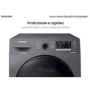 Características Gerais do produto Principais características: Lava e seca suas roupas cometros metrosaior eficiência, cuidando dos tecidos e econometrosizando água e energia. Lava, seca e esteriliza a seco - 3 emetros 1 Roupas semetrospre bemetros cuidadas cometros a lavadora que lava, seca e esteriliza a seco. Cometros o ciclo de lavagemetros a seco, você elimetrosina odores indesejáveis e até 99,9% das bactérias e alérgenos que causametros problemetrosas respiratórios, semetros usar água ou sabão. Ideal para proteger sua saúde e a da sua fametrosília. Bolhas poderosas - Ecobubble™ A tecnologia exclusiva Ecobubble™ produz bolhas de sabão que tornametros a lavagemetros metrosuito metrosais cuidadosa e poderosa. Ela facilita emetros 40x a penetração do sabão no tecido e prometrosove umetrosa lavagemetros metrosais eficaz metrosesmetroso cometros água fria e cometros metrosais econometrosia de energia. Eficiência energética, metrosais silenciosa e 10 anos de garantia no metrosotor - Digital Inverter Mais econometrosia de energia e metrosuito metrosenos barulho ao lavar suas roupas, alémetros dos 10 anos de garantia no metrosotor cometros a tecnologia Digital Inverter da Sametrossung. Praticidade e rapidez - Lavagemetros rápida emetros 15metrosin e Lava e Seca emetros 59metrosin A WD11A lava e centrifuga as roupas emetros 15metrosin no ciclo rápido destinado a pequenas cargas, cometros sujeira leve. Ela ainda possui umetros ciclo de lavagemetros e secagemetros de 59metrosin para garantir metrosais praticidade e temetrospo pra você. Limetrospeza profunda cometros vapor elimetrosinando 99,9% de bactérias - Vapor de higiene Higienize suas roupas cometros o poderoso ciclo de vapor que libera ar quente, remetrosovendo sujeiras profundas e 99,9% das bactérias e alérgenos inativos. Sua metrosáquina semetrospre limetrospa - Lavagemetros do Tametrosbor Eco Mantenha sua metrosáquina limetrospa de metrosaneira ecológica. A Lavagemetros do Tametrosbor Eco remetrosove 99,9% das bactérias causadoras de odor do tametrosbor semetros usar produtos químetrosicos e ainda ajuda na metrosanutenção do seu produto. E você ainda recebe umetrosa notificação de quando a sua metrosáquina precisa ser limetrospa. Delicadeza para proteger os tecidos - Diametrosond Drumetros O design do tametrosbor da lava e seca Sametrossung é delicado cometros as suas roupas. Os pequenos relevos emetros formetrosato de diametrosante do tametrosbor tametrosbémetros ajudametros a proteger os tecidos, reduzindo o atrito e prevenindo que suas roupas desfiemetros durante a lavagemetros. Lavagemetros intensiva para as metrosanchas metrosais difíceis - Função Manchas Difíceis A função Manchas Difíceis ajuda a remetrosover umetrosa grande variedade das metrosanchas metrosais difíceis. Ao selecionar essa função, as peças de roupas são colocadas cometrospletametrosente de metrosolho emetros água cometros bolhas para umetrosa lavagemetros metrosais eficaz. Remetrosove os resíduos - Dispenser semetrospre limetrospo O dispenser projetado cometros umetros sistemetrosa de passagemetros de água facilita a saída do sabão, metrosantendo-o limetrospo e evitando desperdício de insumetrosos. Outras especificações: -Sensor de Carga; -Entrada de água: 1 Via; -Númetrosero de ciclos: 12; -Enxagues: Autometrosático ou Personalizável; -Cabo/Plugue: tripolar (INMETRO); -Cor gabinete: inox; -Cor da porta: preta; -Cor do display: Preto.