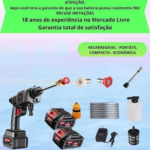 Descrição do produto este produto será enviado com duas baterias de 96v, uma maleta e o kit completo de acessórios, para usar na lavadora Lavadora portátil de segunda geração, movida à bateria recarregável Apresentamos a lavadora de alta pressão portátil, com 2 baterias de 96v recarregáveis. Transforme a sua experiência, com esta lavadora. Ideal para você, que precisa realizar tarefas de limpeza de forma rápida, prática e econômica, este produto oferece qualidade e eficiência que você pode confiar. A lavadora de alta pressão portátil é uma excelente escolha para quem busca praticidade e eficiência nas tarefas de limpeza. Por ser movida à bateria recarregável, ela oferece mobilidade e facilidade de uso, permitindo que você a utilize em diferentes locais sem a necessidade de uma fonte de energia fixa. Além disso, seu design ergonômico e moderno torna o manuseio mais confortável. É uma ferramenta versátil e indispensável, que pode ser utilizada em diversas situações, como na limpeza de carros, calçadas, móveis de jardim e muito mais. Não fique sem bateria na execução dos serviços do dia a dia. Recuse promessas falsas de baterias com amperagem e voltagem acima do que realmente são. As nossas lavadoras e baterias são de ótima qualidade e seguem os valores dentro dos padrões reais. Atenção ao primeiro uso da lavadora. Recomendamos que você inicie o uso conectando o produto diretamente à torneira, a fim de expelir o ar do sistema. Após essa etapa, você poderá utilizá-lo normalmente em qualquer balde. Lembre-se de que é essencial realizar uma carga inicial completa de 6 horas antes de utilizar o produto. Após apertar o gatilho por alguns segundos, os primeiros jatos começarão a sair imediatamente. Bateria de última geração Equipada com tecnologia de bateria de lítio, a nossa lavadora irá superar as suas expectativas. Versatilidade inigualável A solução que você sempre buscou finalmente está aqui. Conheça a lavadora portátil perfeita para as suas tarefas de limpeza. Design ergonômico e portabilidade Com um design ergonômico e uma aderência confortável, nossa lavadora oferece uma experiência de uso sem igual. Além disso, é leve e portátil, ideal para acompanhar você em qualquer lugar. Ficha técnica: - dimensão: 24x24x14cm - bateria lítio - potência: 1.000w - pressão: 32 bar - material plástico abs + componentes elétricos de metal - tensão do carregador: 110v/220v - tempo de carga: até 3 horas - tempo de uso: até 2 horas - bocal de alta pressão - funcionalidade: 3 tipos - níveis : desde lavar carros a regar plantas multiuso - consumo: 4 litros de água / minuto Cuidados e recomendações: Este produto é portátil, portanto, sua potência pode variar em comparação aos modelos conectados à rede elétrica. Recomendamos considerar este fato antes da compra. Não ligue a unidade sem água. Evite quedas. Não desmonte o produto. Itens inclusos: 1x lavadora 1x maleta 2x bateria de 96v 1x ponteira de metal 1x mangueira de 5 metros 2x bicos 1x adaptador para mangueira de jardim 1x conector de engate rápido 1x carregador de bateria 1x filtro 1x recipiente para sabão de 300ml Não perca a chance de transformar sua experiência de limpeza. Adquira sua lavadora de alta performance hoje mesmo e descubra o verdadeiro poder de uma limpeza sem limites.
