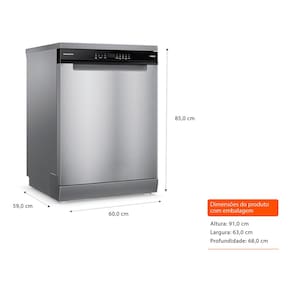 Recomendada para instalacao no chao, a lava-loucas e acompanhada por uma garantia de 12 meses, assegurando tranquilidade e suporte ao consumidor. A embalagem robusta, com dimensoes de 91x63x64 cm, protege o produto durante o transporte, garantindo que ele chegue em perfeitas condicoes ate voce. A escolha perfeita para quem nao abre mao de qualidade e praticidade na rotina diaria.