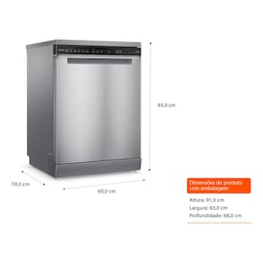 Esta lava-loucas tem uma dimensao de 85x60x59 cm e pesa 50 kg, tornando-a robusta e duravel. Ela vem com 4 pes de plastico, proporcionando estabilidade e facilidade de instalacao na sua bancada de cozinha. Com uma altura de 85 cm, largura de 60 cm e profundidade de 59 cm, este aparelho e compacto, mas espacoso o suficiente para acomodar todas as suas necessidades de lavagem de louca.