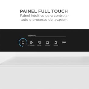 Painel Full Touch, Função Compras, Secagem Extra, Programa Pré-Lavagem, Programa Intenso (higienização a 70°C), Programa Rápido (30 minutos), Programa Eco, Lava 8 serviçosProgramas de lavagem
