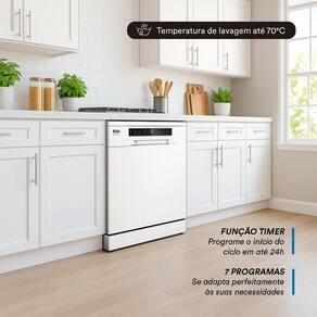Ideal para quem cozinha com frequência e valoriza praticidade, essa lava-louças tem capacidade para 14 serviços e traz um visual branco elegante que se adapta a qualquer ambiente. Ela oferece 7 programas de lavagem, incluindo modos intensivo, ECO, rápido e para vidros, além de funções úteis como meia carga, secagem extra e início programado com até 24h de antecedência.