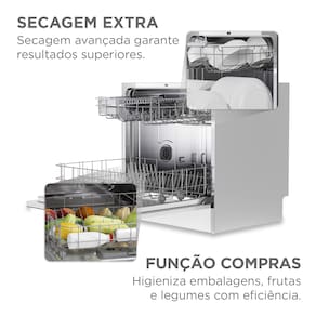 Seu grande diferencial é o Painel Full Touch com display LED branco, onde você controla funções exclusivas como a Função Compras, ideal para higienizar embalagens e alimentos antes de guardar. Para as sujeiras mais pesadas, o Programa Intenso utiliza água a 70°C, garantindo a esterilização total das suas louças, enquanto a Secagem Extra entrega utensílios prontos para o armário, sem manchas de água.