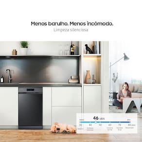 Lava-louças Samsung com 10 serviços Inox, limpeza profunda e silenciosa, secagem rápida com abertura automática da porta e auto ajuste de altura.Programas de lavagem