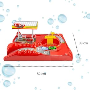 Transforme a brincadeira em uma verdadeira experiência! Com um visual super colorido e detalhes realistas, essa pista oferece tudo o que as crianças adoram: lava rápido com bomba manual de água e jato funcional, posto de combustível com mangueiras para etanol e gasolina, pista com relevo para mais emoção e espaço para os carrinhos aguardarem o abastecimento.