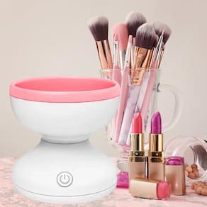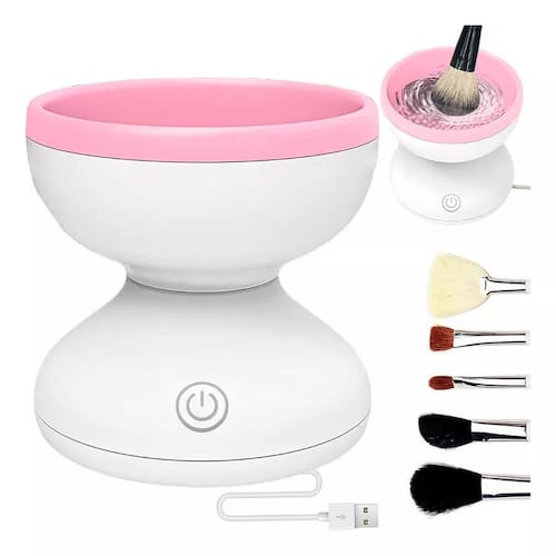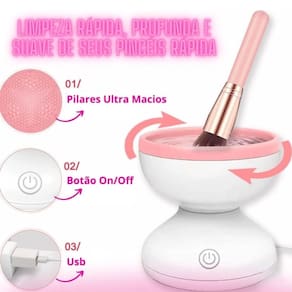 INFORMAÇÕES TÉCNICAS: Alimentação por cabo USB (não acompanha fonte); Para todos os tipos de pincéis de maquiagem; Recipiente giratório com cerdas flexíveis; Botão Liga/Desliga; Portátil.