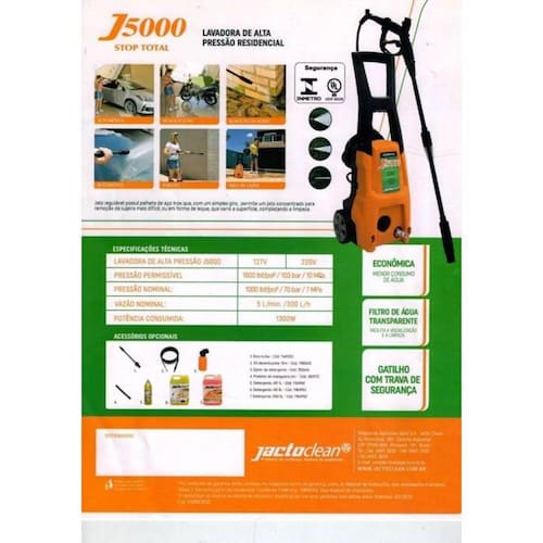 Com design compacto e moderno, a lavadora de alta pressão da linha residencial J5000 é indicada para você, que exige qualidade, economia, praticidade e eficiência na limpeza. Ela foi projetada para agilizar todo o tipo de lavagem doméstica, calçadas, churrasqueiras, arredores de piscinas, esquadrias, escadas, veículos, bicicletas, fachadas, muros.