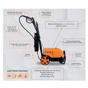 Vantagens: - Cabeçote reforçado em alumínio, Pistões cerâmicos, Válvula de inox, Sistema Stop Total - Carenagem superior e inferior - Protetor frontal - Chave liga/desliga, Vareta de nível de óleo - Rodas Ø200 mm - Extensão com ponteira de regulagem do jato - Suporte de mangueirae cabo elétrico - Motor de indução 2,5 CV/220 V Mono, Bomba axial - Cabo tubular articulável para transporte - Gatilho com trava de segurança