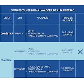 Recomendações de Uso - Linha Comercial. Uso moderado: 2 a 3 horas semanais.Use óculos, luvas e outros equipamentos de proteção individual (EPIs) de acordo com a tarefa a ser executada.Utilize sapato emborrachado e fechado para proteger os pés e evitar quedas.Confira a tensão indicada no produto antes de usá-lo.Nunca toque no plugue ou na tomada com as mãos molhadas.Não trabalhe em posições que não ofereçam segurança.Nunca direcione o jato de água a pessoas, a si mesmo ou ao equipamento.Ao utilizar extensões, utilize plugues e soquetes a prova de água.Recomenda-se consultar o manual de instruções para mais informações.Mantenha o filtro do conector de entrada de água limpo, sua parede transparente permite a visualização de possíveis sujeiras. Abra, faça a limpeza e volte a usar.Armazene em local limpo e seco.Respeite sua cidade e o meio ambiente, para descarte dos produtos e embalagens, siga as orientações de reciclagem vigentes.