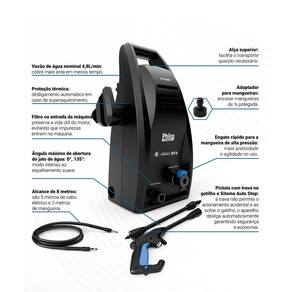 • Potência nominal do motor 1600W • Pressão Nominal (PSI) 1200 PSI • Pressão Máxima (PSI) 1800 PSI • Pressão de entrada de água necessária 1MPa • Vazão de água nominal (l) 4,8L • Vazão de água máxima (l) 6,8L • Alcance total durante o uso (5m de cabo elétrico e 3m de mangueira = 8 metros) • Engate rápido para a mangueira • Gatilho com sistema auto stop • Ajuste de Spray/ Jato • Suporte para todos os acessórios • Ângulo de jato de água com ajuste de abertura de até Variação de 0 a 135° • Filtro na entrada da máquina • Alça para transporte • Adaptador para mangueira de 1/2 • Comprimento da mangueira de alta pressão (3m) • Protetor térmico (desliga o aparelho em casos de sobreaquecimento) • Economia de Água superior (85%)