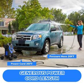 - Comprimento generoso do cabo de alimentação: desfrute de um alcance estendido durante as tarefas de limpeza com o cabo de alimentação de 35 pés e a mangueira de pressão de 20 pés, oferecendo a liberdade de manobrar pelo quintal, garagem ou garagem sem trocar constantemente as tomadas