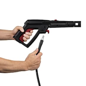 Prática e resistente, a lavadora apresenta uma alça que facilita o transporte, uma mangueira de 3 metros, cordão elétrico de 5 metros, trava de segurança, bico regulável (jato concentrado ou em leque) e um sistema stop total que interrompe o fluxo de água e a energia do motor ao soltar o gatilho, economizando energia e aumentando a vida útil do motor. Esse sistema também garante mais segurança ao utilizar a lavadora em qualquer ambiente.
