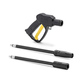 Acompanha esguicho de alta pressão, lança de bico regulável com saída do jato concentrado e jato leque, lança extensora, mangueira de 3 metros, engate rápido e recipiente para detergente.