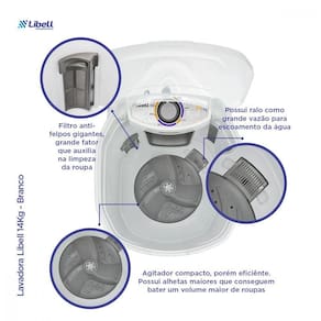 Caracteristicas: - Capacidade para lavar 14kg de roupa seca - Dispenser de sabao em po e amaciante - Timer com 5 programas - Tampa em plastico propileno - Batedor horizontal - Sistema de lavagem atraves de turbilhonamento - Filtro de drenagem - Filtro de antifelpos - Classificacao A em eficiencia de energia - Potencia 1/5hp - Rotacao do motor 1580rpm - Corrente eletrica 1,68A - Capacitor do motor 12 - Garantia: 12 meses