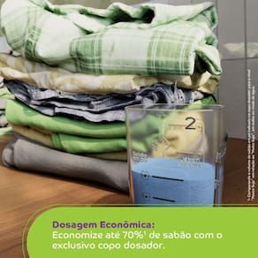 Que tal uma economia esperta na hora de colocar o sabão na máquina? Com o exclusivo copo dosador você sabe a quantidade certa para cada lavagem e economiza até 70% de sabão. Bem pensado, não é?