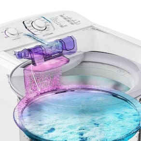 Os produtos diluídos são adicionados a água pelas laterais do cesto e não depositados sobre as roupas, evitando manchas.