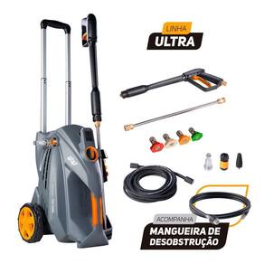 Produto: Lavadora de alta pressão desentupidora 2300 libras - 5100 Turbo Ultra Marca: Wap Voltagem: 220VDescrição: A Lavadora de alta pressão desentupidora 2300 libras 5100 Turbo Ultra da Wap é a melhor opção para limpar sujeiras pesadas e profundas de grandes áreas com rapidez e agilidade, além de desentupir canos, calhas e tubulações com facilidade utilizando jato de água. Com motor de indução, vazão máxima de até 550 L/h, bico turbo, potência de até 2500W e pressão máxima de até 2300 libras, é o equipamento de uso frequente perfeito para a remoção de níveis incrustados de sujeira nos mais diversos tipos de pisos e superfícies. É uma máquina compacta, durável, robusta e super prática para transportar com alças de alumínio retrátil e emborrachada. A WAP 5100 Turbo ULTRA cabe, inclusive, na caixa de transporte de motocicletas. Possui um exclusivo porta-acessórios que ajuda na organização dos componentes do produto e rodas que facilitam o transporte. A WAP 5100 Turbo ULTRA conta com uma bomba axial com cabeçote de alumínio e pistões em aço inox, que garantem mais durabilidade ao produto. Além disso, vem com cabo elétrico de 5 metros, mangueira desentupidora de 2 metros e mangueira de alta pressão com trama de aço de 10 metros que permitem cobrir uma grande área sem precisar locomover a máquina. Equipado com gatilho com trava de segurança, bicos de 15, 25 e 40 além do sistema stop total, que corta o fluxo de água e a energia do motor ao soltar o gatilho, poupando energia e aumentando a vida útil do motor. E, para o trabalho ficar ainda mais fácil e dinâmico, vem equipada com o engate rápido e filtro, para você montar e desmontar a mangueira em um clique, sem a necessidade de usar ferramentas. A Lavadora de Alta Pressão Desentupidora WAP 5100 Turbo ULTRA é uma excelente máquina para ser Utilizado em empreendimentos como: pequenos mercados, padarias, restaurantes, frutarias, açougues e condomínios. Com a WAP 5100 Turbo ULTRA você pode chegar muito mais longe. Características principais: – 2 em 1, o Dobro de Vantagens Lavadora de Alta Pressão Desentupidora com Mangueira de Desobstrução; • Máquina compacta e robusta, garanta rapidez e agilidade na limpeza de sujeiras pesadas e profundas de grandes áreas. • a WAP 5100 Turbo ULTRA é perfeita para lavar, limpar e desentupir tubulações, ralos, privadas, pias de cozinha, calhas, drenos de máquinas de lavar roupas, lava-louças e muito mais. • Mangueira Desentupidora de 2 metros: A Lavadora WAP 5100 Turbo ULTRA acompanha exclusiva Mangueira de Desobstrução por Jato de Água. Mangueira resistente, flexível e durável, que facilita o trabalho de desentupimento, como um profissional; • Excelente máquina para ser Utilizado em empreendimentos como: pequenos mercados, padarias, restaurantes, frutarias, açougues e condomínios.Especificações: Potência elétrica: 2500 wPressão máxima: 2300 psiFrequência: 60 hzClasse de isolação: 1Cabo elétrico: 5 metrosMangueira: 10 metros de trama de açoBico turbo: SimShampoozeira: NãoMotor: InduçãoVazão: 550 l/hFrequência: 60hzCor: Cinza com amarelo. Bomba axial com cabeçote de alumínio. Componentes:pistões de aço inox.Cabo elétrico de 5 metros.Sistema Stop Total.Gatilho com trava de segurança.Filtro de água.Espigão para conexão da mangueira.2 Rodas para transporte.Alça ergonômica retrátil e emborrachada.Botão liga e desliga ergonômico e de fácil acesso.Suporte para acessórios. Bomba axial com cabeçote de aluminio.Pistões em aço inox.Cabo elétrico de 5 metros.Porta-acessórios.Alça para transporte.2 Rodas para transporte.Filtro de entrada de água.Suporte de mangueira e cabo elétrico.Sistema Stop Total.Itens Inclusos: 1 Ferramenta de aplicação de alta pressão com conexão de rosca M22.1 Lança de inox com conexão rápida em latão.4 Bicos com conexão rápida 0, 15, 25 e 40 .1 Bico Turbo com conexão rápida.1 Mangueira de alta pressão com 10 m de trama de aço.1 Mangueira desentupidora de 2 metros.