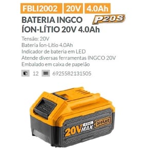 Lavadora de alta pressão ingco à bateria íon-lítio 20v Características: Tensão: 20v Pressão máxima: 24,8 bar 360 psi Taxa de fluxo: 2,2l / min Sistema de parada automática 1 bateria 4.0ah 1 carregador de baterias bivolt 1 conjunto de Ferramenta de aplicação de pulverização de 6 padrões 1 mangueira de entrada de água de 6 m com conector rápido 1 conector de auto-sucção 1 aplicador de detergente e 400ml 1 bolsa portátil Embalado em caixa de papelão Quanto maior a amperagem da bateria intercambiável ingco maior é o tempo de trabalho da lavadora sem a necessidade de troca ou recarga da bateria. Temos kit com baterias de 2.0; 4.0; 5.0; 6.0 e 7.5 amperes. Marca: Não Informado