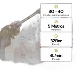 Tensão da bateria: 48 v. Material plástico abs+ componentes elétricos Potencia: 1000w Tensão do carregador: 110v/220v Tempo de carga: 3 horas Tempo de uso: 1 horas Tamanho da mangueira: 5 metros Bocal de metal de alta pressão Níveis de pressão: desde lavar carros á regar plantas Carga de fluxo: 4 litros Marca: Não Informado