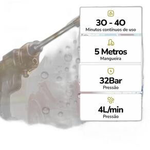 Tensão da bateria: 48 v. Material plástico abs+ componentes elétricos Potencia: 1000w Tensão do carregador: 110v/220v Tempo de carga: 3 horas Tempo de uso: 1 horas Tamanho da mangueira: 5 metros Bocal de metal de alta pressão Níveis de pressão: desde lavar carros á regar plantas Carga de fluxo: 4 litros Marca: Não Informado