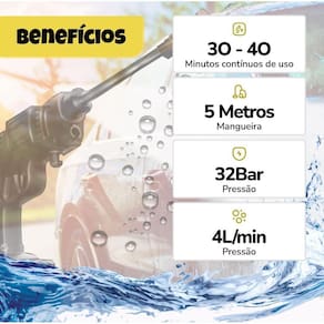 Lavadora jato de alta pressão recarregável portátil sem fio cor preto frequência 60hz voltagem 110v/220v Com essa lavadora de alta pressão, você poderá deixar brilhando qualquer material ou superfície. Otimizando seu tempo e tornando o processo de limpeza fácil e eficaz. O tamanho do motor se assemelha muito ao de uma furadeira, ele torna água parada em um jato bem potente que tira qualquer tipo de sujeira de carros, calçadas, paredes, bicicletas, cerâmicas e motos de uma forma rápida e eficaz. Como ele é um produto totalmente recarregável, não necessita ter proximidade com tomadas ou extensões , como nos modelos convencionais.