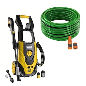 - Acompanha: pistola de alta pressão com trava, ponteira turbo, ponteira para regular o jato de saída de água, mangueira de alta pressão, filtro para sucção de água, dispositivo interno para aplicação de sabão, engate rápido e manual de instruções.