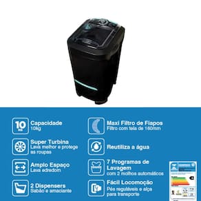 Principais Características: -Capacidade de Lavagem: 10kg -7 Programas de Lavagem com 2 Molhos Automáticos -Não centrifuga (ideal para quem deseja controle manual do processo) -Entrada e Saída de Água Manuais -Motor com Tecnologia WEG – Alta Performance e Durabilidade -Lava até Edredom de Casal ou 66 Camisetas por ciclo -2 Dispensers: um para sabão e outro para amaciante -Maxifiltro de Fiapos -Pés Reguláveis e Alça para Transporte -Voltagem: 127V ou 220V (Não e bivolt) -Cor: Preta com detalhes verdes