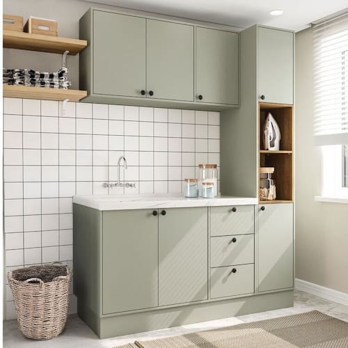 A lavanderia completa Rubi Verde Oliva da Politorno Móveis é a solução ideal para quem busca praticidade, organização e um design moderno em um único conjunto. Composta por um armário aéreo de 3 portas, um armário alto com 2 portas e 2 nichos e um balcão com espaço para pia com 2 portas e 3 gavetas, ela oferece amplo espaço para armazenar e organizar todos os itens da sua lavanderia. O conjunto possui 156,8 cm de largura, 214 cm de altura e 49 cm de profundidade, aproveitando cada centímetro do ambiente de forma inteligente. Seu acabamento em pintura UV garante maior durabilidade, resistência contra o desgaste diário, facilidade na limpeza e um brilho sofisticado que valoriza ainda mais o tom verde oliva, transformando a lavanderia em um espaço funcional, elegante e cheio de estilo. Acabamento: Pintura UV Suporta Até (kg): 10 kg Possui Rodízio: Não Altura do Conjunto: 214 cm Ambiente: null Ambiente Principal: Área de Serviço Cor: Verde Oliva Informação Complementar: 1x Armário Aéreo 3 Portas Rubi Verde Oliva Largura: 120 cm Altura: 59 cm Peso: 14,61 kg Profundidade: 29 cm Necessita Montagem: Sim