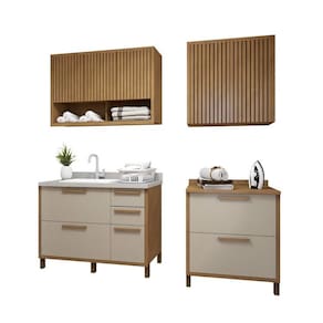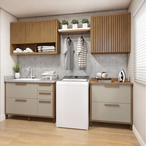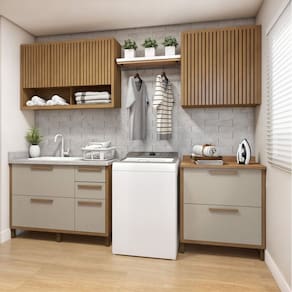 Se a sua área de serviço anda meio sem graça, que tal dar um upgrade com o nosso Lavanderia Modulada de móveis Torino? As portas ripadas do aéreo deixam o ambiente mais estiloso, sem contar com o nicho que um disponibiliza, perfeito para exibir plantinhas e coleções. Já os dois balcões são perfeitos para organizar tudo sem drama, além de vir com tampo preparado para receber pia de inox! Design moderno, super prático e ainda cabe aquele seu produto de limpeza que nunca sabe onde colocar. Deixa sua área de serviço arrumada e com cara de Pinterest. Possui Portas: Sim Possui Rodízio: Não Altura do Conjunto: 97 cm Ambiente: null Ambiente Principal: Área de Serviço Cor: Cinamomo/Off White Informação Complementar: 1x Armário Aéreo para Cozinha 120cm 3 Portas Ripado Torino Cinamomo Largura: 120 cm Altura: 80 cm Peso: 31,9 kg Profundidade: 32 cm Necessita Montagem: Sim