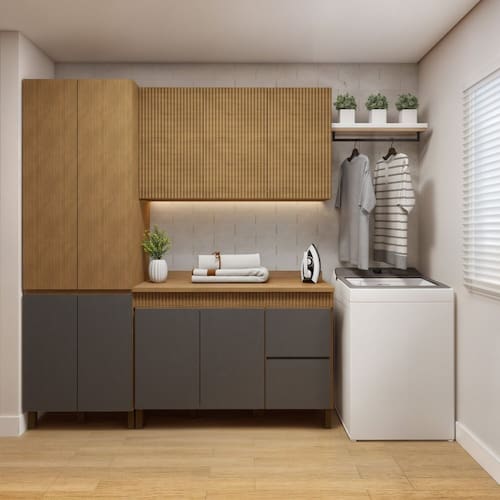 Está querendo dar um up na área de serviço e deixar tudo organizado com estilo? Nosso Lavanderia Modulada com de móveis Dakota é a escolha perfeita! Vem com um armário aéreo com porta frisada para aquele toque moderno, um balcão com detalhe frisado que é puro charme, além de ser super espaçoso e ainda um armário multiúso que cabe de tudo ? do balde a produtos de limpeza, sem aperto. Além de funcional, vai transformar sua área de serviço no cantinho mais organizado e bonito da casa! Bora dar aquele toque de estilo e praticidade? Acabamento: Pintura UV Suporta Até (kg): 30 kg Possui Rodízio: Não Altura do Conjunto: 216 cm Ambiente: null Ambiente Principal: Área de Serviço Cor: Cinamomo/Grafite Informação Complementar: 1x Paneleiro Fechado 4 Portas 5 Prateleiras Dakota Cinamomo/Grafite Largura: 70 cm Altura: 216 cm Peso: 59 kg Profundidade: 53 cm Necessita Montagem: Sim