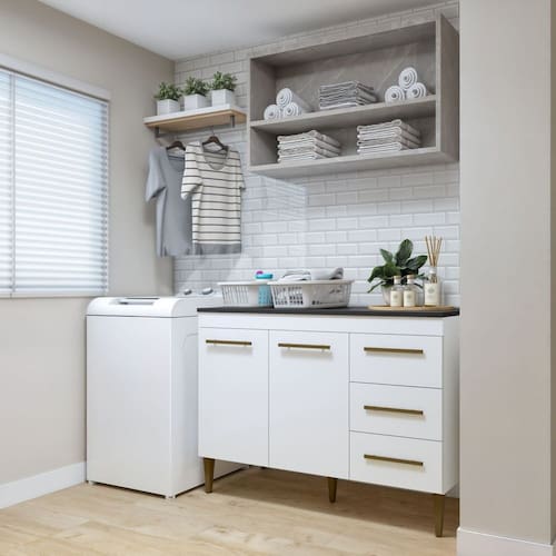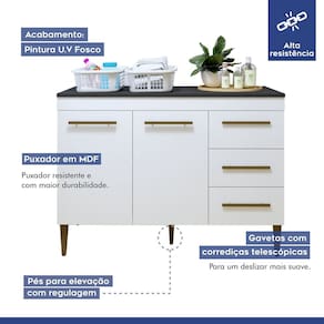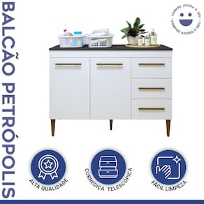 O Balcão 2 Portas 3 Gavetas Petrópolis é a solução perfeita para manter sua área de serviço organizada e funcional. Com amplo espaço de armazenamento, suas 2 portas e 3 gavetas são ideais para guardar desde produtos de limpeza até utensílios e acessórios diversos. Feito com materiais de alta qualidade, oferece durabilidade e resistência para o uso diário. Seu design moderno e versátil combina facilmente com diferentes estilos de decoração. Além disso, o balcão proporciona uma superfície prática para apoiar objetos ou realizar pequenas tarefas. Transforme sua área de serviço com elegância e praticidade! Acabamento da Gaveta: Pintura Acabamento da Porta: Pintura Acabamento da Prateleira: Pintura Acabamento dos Pés: Pintura Altura dos Pés: 17 cm Ambiente Principal: Área de Serviço codigo_ean: 7909903953280 Complexidade da Montagem: Alta: deve ser montado por um montador especializado Cor: Branco Cor do Produto: Branco Escala de Brilho: Fosco Escala de Brilho da Gaveta: Fosco Escala de Brilho da Porta: Fosco Escala de Brilho da Prateleira: Fosco Gaveta com Chave: Não Itens Inclusos: 1 Balcão e manual de montagem. Manual de Montagem e Instalação: https://product-hub-prd.madeiramadeira.com.br/954034/documents/b58b6877-1c0b-47b9-8951-9c0ac3e06f77238847473217273670694092.pdf Material da Gaveta: MDP Material da Porta: MDP Material da Prateleira: MDP Material do Puxador da Gaveta: MDF Material do Puxador da Porta: MDF Material dos Pés: Plástico Material Principal: MDP Necessita Montagem: Sim Origem do Produto: Nacional Pés Reguláveis: Não Peso: 42 kg Peso Máximo por Gaveta: 5 kg Peso Máximo por Prateleira: 10 kg Porta com Fechadura: Não Possui Espelho: Não Possui Pés: 05 Quantidade de Gavetas: 03 Gavetas Quantidade de Prateleiras: 01 Prateleira Recomendações de Uso, Manutenção e Limpeza: Limpar com pano macio e levemente umedecido. Não utilizar solventes a base e de inflamáveis. Não utilizar produtos abrasivos. Sapatas Niveladoras: Não Sistema de Montagem: Parafusos e Cavilhas. Suporta Até (kg): 50 kg Tipo de Corrediça da Gaveta: Metálica Telescópica Tipo de Dobradiça/Corrediça da Porta: Metálica Tipo de Gaveta: Externa Tipo de Porta: Bater Tipo de Puxador da Gaveta: Externo Tipo de Puxador da Porta: Externo