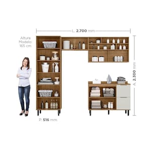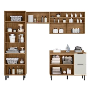 A Lavanderia Modulada Toscana é a decisão certa para transformar sua área de serviço com organização e praticidade. Composto por dois armários aéreos, um balcão com tampo e um armário multiuso, ele oferece espaço de sobra para armazenar produtos de limpeza, ferramentas e acessórios essenciais. O multiuso possui prateleiras amplas, enquanto os aéreos proporcionam uma superfície útil para apoio e deixar os produtos do dia a dia à mão. Além disso, um dos aéreos possui nichos para expor suas coleções ou plantinhas , o que proporciona elegância. Feito com materiais de qualidade, é resistente e funcional, adaptando-se perfeitamente a diversos ambientes. Com design moderno, garante estilo e eficiência no seu dia a dia! Acabamento da Gaveta: Pintura Texturizada UV Acabamento da Porta: Pintura Texturizada UV Acabamento da Prateleira: Pintura Texturizada UV Acompanha Manual de Instalação: Sim Altura dos Pés: 15 cm Altura Máxima dos Pés: 15.0000 Ambiente Principal: Área de Serviço codigo_ean: 7900288062154 Complexidade da Montagem: Média: pode ser montado por mais de uma pessoa e/ou necessite de maior conhecimento para montagem Cor: Freijó/Off White Cor do Produto: Freijó/Off White Cor Interna: Freijó Escala de Brilho: Semi-Brilho Escala de Brilho da Gaveta: Semi-Brilho Escala de Brilho da Porta: Brilhante/Fosco Escala de Brilho da Prateleira: Semi-Brilho Espessura da Chapa: 15 mm Fita Integrada: Não Gaveta com Chave: Não Itens Inclusos: 1 Aereo + 1 Aereo Basculante + 1 Balcão Pia + 1 Multiuso + 1 Tampo + Kit Ferragens + Manual de Montagem Linha ou Coleção: Toscana Manual de Montagem e Instalação: https://product-hub-prd.madeiramadeira.com.br/976330/documents/ef089c40-a9e5-4ee1-b2cb-8c6896eadb932659859539817385906608237.pdf Marca: Espresso Móveis Material da Gaveta: MDF Material da Porta: MDF/Vidro Material da Prateleira: MDF Material do Puxador da Gaveta: Alumínio Material do Puxador da Porta: Alumínio Material dos Pés: ABS Material Principal: MDF modular: Sim Necessita Montagem: Sim O Módulo Pode ser utilizado individualmente: Sim Origem do Produto: Nacional Pés Reguláveis: Sim Pés Removíveis: Sim Peso: 161,7 kg Peso Máximo por Gaveta: 3 kg Peso Máximo por Prateleira: 6 kg Possui Cabideiros: Não Possui Espelho: Não Possui Pés: 09 Possui Suporte para Vassoura: Não Possui Tábua: Não Possui Tulha/Cesto: Não Possui Vidro: Sim Prateleiras Removíveis: Não Quantidade de Gavetas: 03 Gavetas Quantidade do Produto: 1 Recomendações de Uso, Manutenção e Limpeza: Para manter seu móvel novo por muito mais tempo, evite locais úmidos, mantenha-o distante de líquidos e de fontes de calor. Evite a exposição prolongada ao sol. Para limpá-lo com segurança utilize uma flanela seca sem produtos abrasivos e nem lustra móveis. Resistente à Chuva: Não Sapatas Niveladoras: Não Sistema de Montagem: Parafusos e Cavilhas Suporta Até (kg): 70 kg Tipo de Armário Multiuso: Armário Multiuso Tipo de Corrediça da Gaveta: Metálica Telescópica Tipo de Dobradiça/Corrediça da Porta: Aço Tipo de Gaveta: Interna e Externa Tipo de Porta: Misto (Bater e Basculante) Tipo de Puxador da Gaveta: Externo Tipo de Puxador da Porta: Externo undefined: 976326