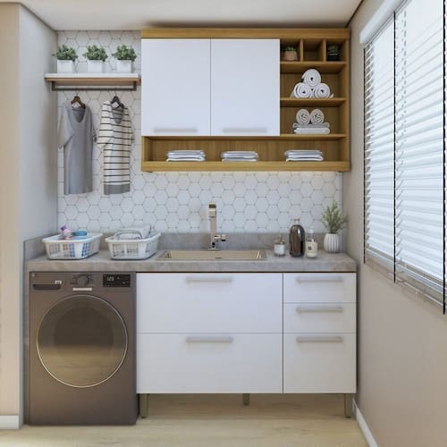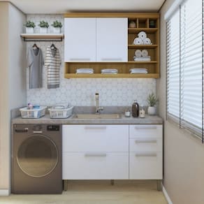 Transforme sua área de serviço em um ambiente prático e moderno com nosso conjunto de móveis para lavanderia. O armário aéreo é um charme, com nichos que servem como prateleiras para exibir suas decorações preferidas, como vasos de plantas ou aquele jogo de pratos que você ama. E o balcão? Ele é totalmente funcional, projetado para receber pia, e com gavetas capazes de organizar tudo, desde os produtos de limpeza até as ferramentas que você usa para pequenos reparos. Com esse kit, sua área de serviço vai brilhar com praticidade e bom gosto! Possui Portas: Sim Suporta Até (kg): 30 kg Possui Rodízio: Não Altura do Conjunto: 86.2 cm Ambiente: null Ambiente Principal: Área de Serviço Cor: Amadeirado Freijó/Branco Informação Complementar: 1x Armário de Cozinha Aéreo 2 Portas Nicho Adega Burguesa Premium 100% MDF Amadeirado Freijó/Branco Largura: 120 cm Altura: 86,2 cm Peso: 34,1 kg Profundidade: 32 cm Necessita Montagem: Sim