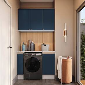 Até as lavanderias mais compactas merecem a beleza e a qualidade do 100% MDF da Celeste da Kappesberg. Com três módulos, práticos e funcionais, o combo CB1294 é perfeito para quem possui pouco espaço, mas não abre mão de organização. Ideal para armazenar toalhas, cestos e produtos de limpeza, você poderá transformar sua lavanderia de uma forma simples e com muita qualidade. Com até sete camadas de pintura, a caixaria é na cor branco brilho, enquanto as frentes são em azul profundo, com acabamento fosco. Uma combinação elegante e clean, ideal para quem gosta de composições clássicas, e combinando perfeitamente com esse ambiente, ele ainda garante facilidade na limpeza. E para um acabamento perfeito, o combo possui rodapés, mas acompanha as ferragens para ser montado suspenso na parede. Outra opção, é adquirir os pés separadamente. E para um projeto ainda mais completo, o nicho com corrediças telescópicas, conta com o espaço perfeito para itens menores, enquanto as portas possuem amortecimento, proporcionando um fechamento suave, sem ruído e mais durabilidade. Os puxadores, metálicos e dourados, com modelos diferentes nos balcões e aéreos, completam a beleza e diferencial do produto.