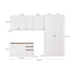 Todo espaço e funcionalidade que você e sua lavanderia merecem, aliado a qualidade do 100% MDF com a Celeste da Kappesberg. Com amplo espaço e muita beleza, o combo CB1288 conta com cinco módulos para transformar sua lavanderia e facilitar as tarefas diárias. E para manter tudo no lugar, o combo possui as divisórias perfeitas, entre prateleiras e gavetas, para armazenar tudo que você precisar e deixar seus calçados e produtos de limpeza em ordem. Com até sete camadas de pintura, sua cor branco brilho é perfeita para todos os ambientes e tamanhos, garantindo mais luminosidade e praticidade, além de facilitar a limpeza e dar um toque de elegância aos produtos. Para um acabamento perfeito, o combo conta com rodapés, mas acompanha as ferragens para ser montado suspenso na parede. Outra opção, é adquirir os pés separadamente. As portas possuem amortecimento, o que proporciona um fechamento suave, sem ruído e mais durabilidade, enquanto as gavetas, com corrediças telescópicas, são perfeitas para itens menores, como panos, escovas, esponjas e outros. E os puxadores, metálicos e dourados, com modelos diferentes no balcão e aéreos, completam a beleza e diferencial do produto.