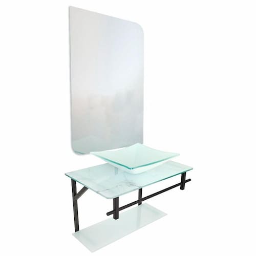 - Cor Branco Marmorizado. Cuba em vidro temperado 10mm. Tampo e prateleira em vidro lapidado 8mm. Espelho 4mm. Suportes em metal resistente