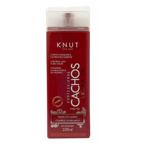 Leave-in para cabelos ondulados, cacheados ou crespos. Knut Cachos Leave-in define, controla o frizz e promove vitalidade, além de proteger dos raios UV. Knut Cachos Leave-in possui uma fórmula suave que dispensa a necessidade de lavar sempre que precisar reaplicar. Assim, ajuda a manter a hidratação e o formato dos fios por mais tempo com aparência saudável e movimento natural. Ação Colágeno: ajuda a reter água no fio por mais tempo e corrige desníveis na cutícula. Arginina: permite a troca de nutrientes entre a raiz e os fios, forma uma película protetora que fecha as escamas e fortalece o cabelo. Produto livre de parabenos, ftalatos e ingredientes animais. Não testado em animais. Como Usar Knut Cachos Conselho de Aplicação Coloque uma pequena quantidade do leave-in nas mãos, esfregue uma na outra e aplique no cabelo úmido ou seco apertando da ponta para cima. Finalize como de costume. Resultado Seu cabelo fica definido e disciplinado, com brilho e maciez. Marca: Knut Hair Care Ean: 7898483150281