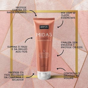 Midas leave in - 250mlFinalizador sem enxágue para a proteção contra a ação dos raios solares e o calor dos secadores e chapinhas, eliminando o frizz e reduzindo o excesso de volume. O midas leave in cria uma camada protetora nas escamas dos fios e os condiciona.Resultados: cabelos protegidos e sem friz.Indicado para: todos os tipos de cabelos.Ativos: mix de 12 óleos: cálamo, mirra, argan, karité, coco, camomila, chá verde, macadâmia, canela, oliva, aloe vera e algodão.Modo de uso: após a lavagem dos cabelos, seque os cabelos com uma toalha e aplique no comprimento e nas pontas dos cabelos. Não enxágue e penteie normalmente.Precauções: uso externo, manter fora do alcance das crianças. Proteger da luz solar e do calor excessivo. Não ingerir. Em caso em contato com os olhos e mucosas lavar abundantemente com água, se necessário procure um médico. Não aplicar se o couro cabeludo estiver irritado ou lesionado. Em caso de sensibilização suspender o uso.RESOLUÇÃO ANVISA 25351.164857/2019-16Qualquer dúvida estaremos à disposição para responder suas perguntas