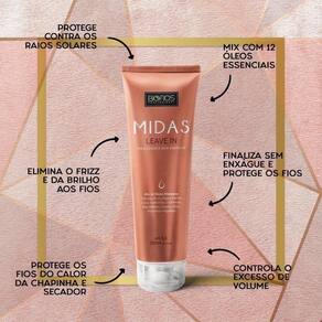 Finalizador sem enxágue para a proteção contra a ação dos raios solares e o calor dos secadores e chapinhas, eliminando o frizz e reduzindo o excesso de volume. O midas leave in cria uma camada protetora nas escamas dos fios e os condiciona.