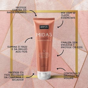 Midas leave in - 250ml Finalizador sem enxágue para a proteção contra a ação dos raios solares e o calor dos secadores e chapinhas, eliminando o frizz e reduzindo o excesso de volume. O midas leave in cria uma camada protetora nas escamas dos fios e os condiciona. Resultados: cabelos protegidos e sem friz. Indicado para: todos os tipos de cabelos. Ativos: mix de 12 óleos: cálamo, mirra, argan, karité, coco, camomila, chá verde, macadâmia, canela, oliva, aloe vera e algodão. Modo de uso: após a lavagem dos cabelos, seque os cabelos com uma toalha e aplique no comprimento e nas pontas dos cabelos. Não enxágue e penteie normalmente. Precauções: uso externo, manter fora do alcance das crianças. Proteger da luz solar e do calor excessivo. Não ingerir. Em caso em contato com os olhos e mucosas lavar abundantemente com água, se necessário procure um médico. Não aplicar se o couro cabeludo estiver irritado ou lesionado. Em caso de sensibilização suspender o uso. RESOLUÇÃO ANVISA 25351.164857/2019-16 Qualquer dúvida estaremos à disposição para responder suas perguntas Ean: 7898636360451