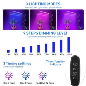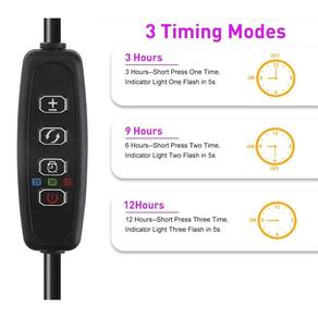 -?Função de temporização?As luzes de cultivo de plantas com função de temporização automática são as mais recentes lâmpadas de crescimento de plantas. Não só você pode configurá-lo para iluminação a cada 3 horas, 6 horas ou 12 horas, mas também pode ajustar a distância entre a luz e as plantas, de acordo com as necessidades da planta. Nota: Sugerimos que adote o adaptador de plugue USB necessário abaixo de 3A (sem adaptador)