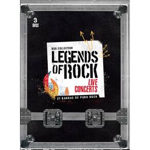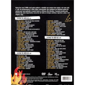 Box composto por 3 DVD's, contendo 21 das melhores bandas do bom e velho rock, num total de 63 músicas dos seus maiores sucessos, em interpretações históricas . Legends of rock vol.01 FxBandaTítulo 01Pink floydShine on you crazy diamond 02Led zeppelin Black dog 03AcdcBack in black 04Black sabbathBlack sabbath 05Deep purple Highway star 06Kiss Psycho circus 07WhitesnakeAint no love in the heart of the city 08Bon jovi You give love a bad name 09SupertrampBreakfast in america 10Guns and rosesLive and let die 11ScorpionsRock you like a hurricane 12RushManhattan project 13Dire straitsWalk of life 14MetallicaMaster of puppets 15Red hot chili peppersMonarchy of roses 16Linkin parkTinfoil 17AerosmithJanes got a guns 18Iron maidenRun to the hills 19Eric claptonCrossroads 20QueenLove of my life 21Ozzy osbourneI dont know Legends of rock vol.02 FxBandaTítulo 01Pink floydTime 02Led zeppelin Kashmir 03AcdcThunderstruck 04Black sabbathWar pigs 05Deep purpleSpace truckin 06KissI love it loud 07WhitesnakeHere i go again 08Bon jovi Wanted dead or alive 09SupertrampIts raining again 10Guns and rosesParadise 11ScorpionsBlakout 12RushThe spirits of radio 13Dire straitsBrothers in arms 14MetallicaNotinhg else mathers 15Red hot chili peppers Give it away 16Linkin parkPapercut 17AerosmithCome together 18Iron maiden Wratchild 19Eric claptonI shot the sheriff 20QueenBohemian rhapsody 21Ozzy osbourneShot in the dark Legends of rock vol.03 FxBandaTítulo 01Pink floydWish you are here 02Led zeppelin Starway to heaven 03AccdHells bells 04Black sabbathIron man 05Deep purple Smoke on the water 06Kiss Lick it up 07WhitesnakeFool for your loving 08Bon jovi Its my life 09SupertrampLogical song 10Guns and rosesSweet child o mine 11ScorpionsBig city nights 12RushThe big money 13Dire straitsMoney for nothing 14MetallicaThe unforgiven 15Red hot chili peppers Under the bridge 16Linkin parkPoints of autority 17AerosmithMama kin 18Iron maiden The number of the beast 19Eric claptonLay down sally 20QueenCrazy litle thing called love 21Ozzy osbourneMr. Crowley Ean: 7898587242677